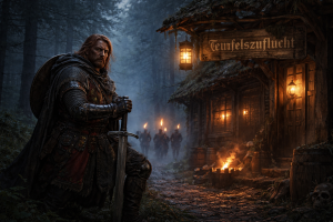 Im Inneren flackern Feuer und Fackeln über grobe Tische, Waffen und Beute. Die Teufelszuflucht ist kein gewöhnliches Gasthaus – sie ist ein Ort der Gesetzlosigkeit, an dem nur Stärke zählt.